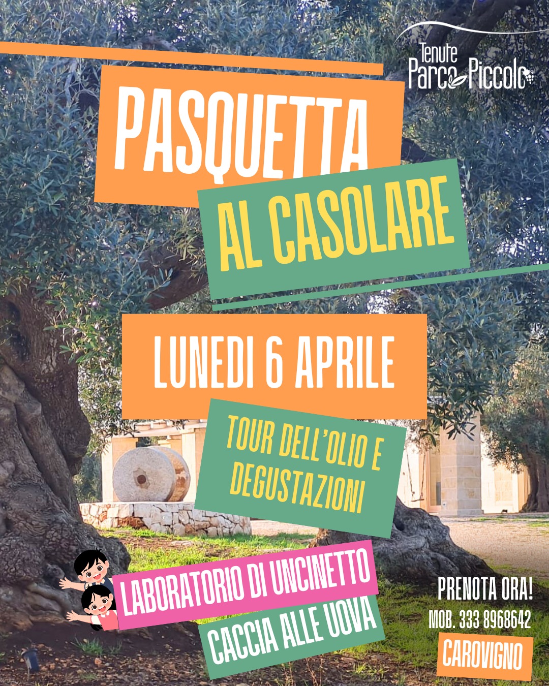 In occasione della giornata di Pasquetta, le TenuteParco Piccolo di Carovigno organizzano una giornata in natura con tour dell’olio e laboratori per bambini presso l’antico casolare.