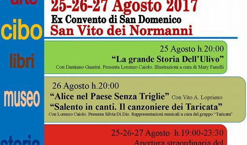 In arrivo “Notti della Cultura Mediterranea”, 25/ 26/27 agosto: i protagonisti dell’evento Radici da vivere attraverso il canto della nostra terra, la storia dei suoi ulivi, i racconti che ne fanno la tradizione popolare, gli odori della sua cucina: in arrivo a San Vito dei Normanni le Notti della Cultura Mediterranea, evento organizzato dall’associazione socio-ricreativa “RicreAzione” di Mesagne per i giorni 25, 26, 27 agosto nel Chiostro dei Domenicani di via Mazzini.