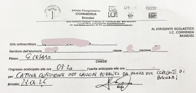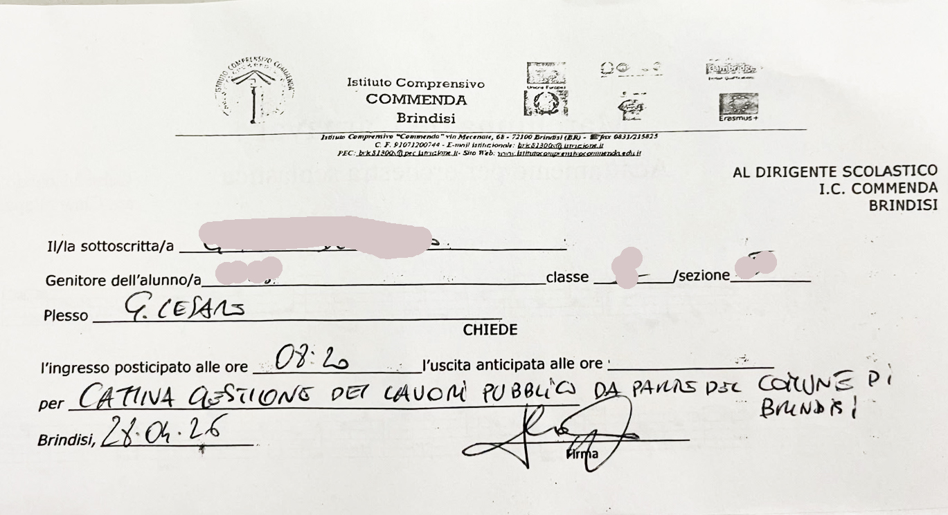 Nel documento scolastico, compilato per giustificare l’ingresso posticipato, si legge chiaramente la motivazione: “cattiva gestione dei lavori pubblici da parte del Comune di Brindisi”. Un’accusa diretta che non mancherà di alimentare il dibattito sull’ennesima criticità nella gestione dei cantieri e nella pianificazione della viabilità.