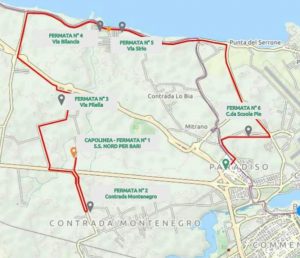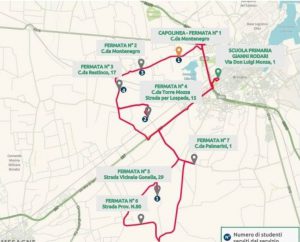 I percorsi individuati sono quelli per gli alunni della scuola primaria Gianni Rodari al quartiere Commenda e Grazia Deledda al Paradiso. Ne usufruiranno gli studenti nella zona a nord-ovest di Brindisi attraverso due itinerari. Il primo tra contrada Montenegro e la strada provinciale 43 per Restinco, prosegue per strada vicinale Gonella, passa anche per Contrada Palmarini e termina in via Don Luigi Monza.