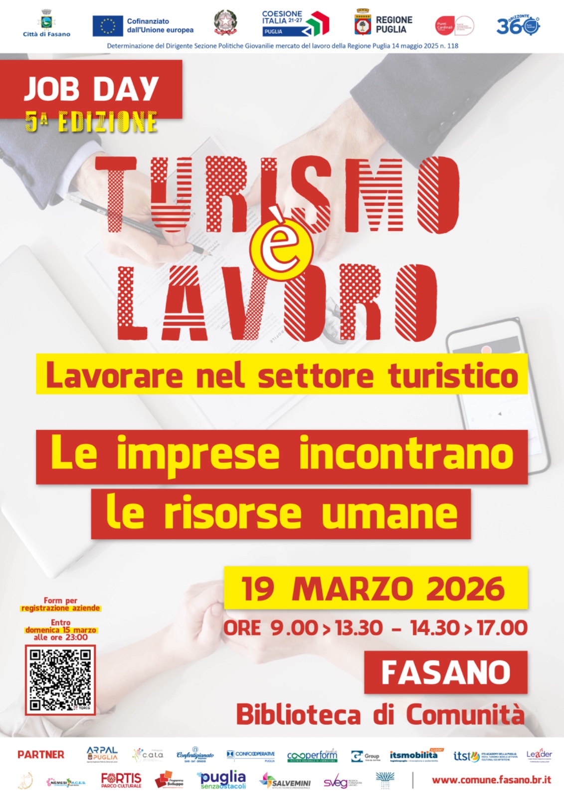 «Siamo ormai giunti alla quinta edizione del Job Day “Turismo è Lavoro”. Quest’anno l’evento – dice la consigliera comunale con delega ai Job days e all’incontro domanda-offerta di lavoro Madia Decarolis – si inserisce nel più ampio progetto “Punti Cardinali For Work”. Punti di orientamento per la formazione e il lavoro” al quale il Comune di Fasano ha aderito presentando un articolato progetto che è stato interamente finanziato dalla Regione Puglia. Ringrazio, in particolar modo, l’intero Assessorato alle Politiche giovanili e gli uffici comunali che si sono proficuamente adoperati per la candidatura del progetto. Quello del 19 marzo 2026 sarà il primo dei tre Job Days che organizzeremo all’intero del progetto “Punti Cardinali” e che, auspichiamo, saranno utilizzati, come già negli scorsi anni, quale cerniera tra le aziende turistiche del territorio alla ricerca di personale e i cittadini alla ricerca di impiego nel settore turistico. I dettagli relativi al programma della giornata e alle modalità di accesso per i candidati saranno resi noti nei prossimi giorni».