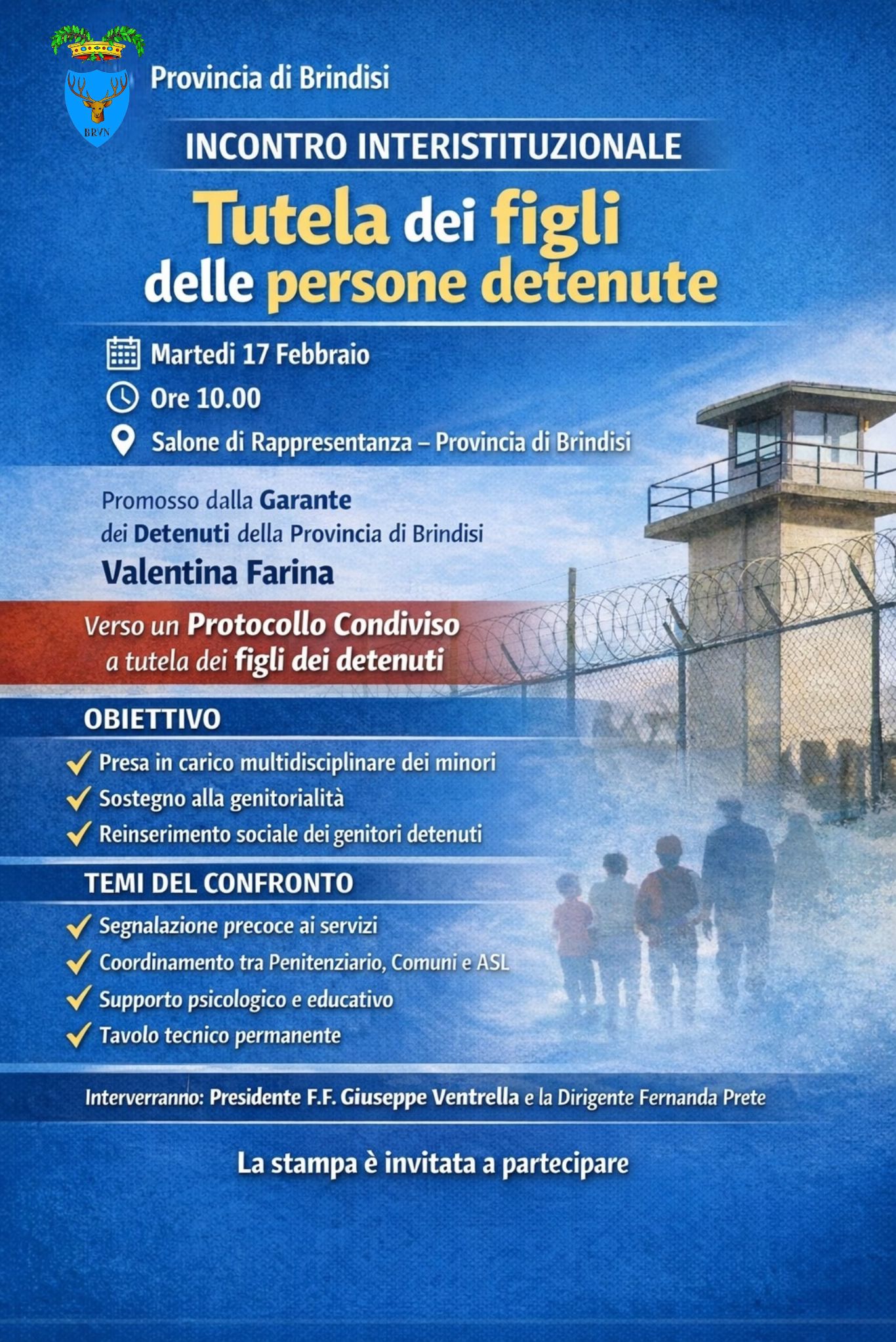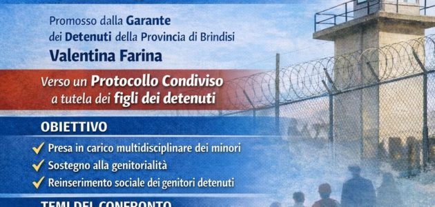 È stato convocato per martedì 17 febbraio alle ore 10.00 nel salone di rappresentanza della Provincia di Brindisi un incontro interistituzionale col fine di avviare un confronto concreto e operativo per la definizione di un protocollo condiviso a tutela dei figli delle persone detenute presso la Casa Circondariale di Brindisi.