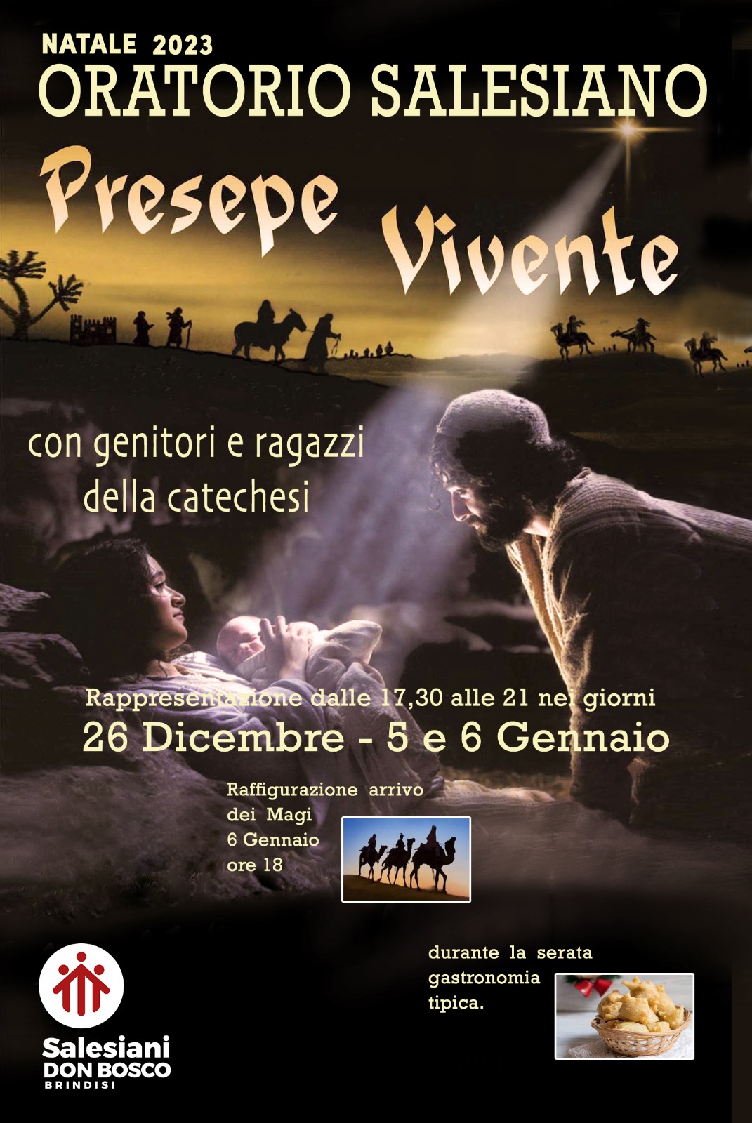 In occasione degli 800 anni del Presepe vivente, realizzato da San Francesco d’Assisi a Greccio nel 1223, i Salesiani offrono l’opportunità di visitare la I edizione del Presepe Vivente presso l’Oratorio Salesiano. Grazie alla collaborazione di genitori, ragazzi e bambini potrete contemplare con stupore la scena del Natale, respirando quel clima di semplicità e di umiltà che ci fa sentire Gesù vicino alla nostra quotidianità.