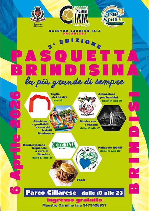 Con l’avvicinarsi della Pasqua torna l’appuntamento ormai immancabile de “La Pasquetta brindisina” ideata e organizzata dal maestro Carmine Iaia in tandem con le associazioni di “Uniti Per Lo Sport”, giunta alla sua V Edizione e accompagnata da uno slogan d’eccezione “…la più grande di sempre”.