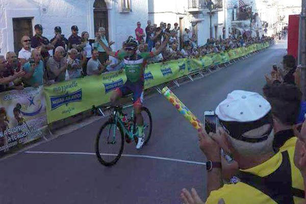 Non è stato di certo semplice spuntarla tra i 95 partenti che oggi hanno preso il via alla competizione tenendo duro sul lungo percorso di quasi 150km di Ceglie Messapica e che nonostante il periodo settembrino ha mantenuto temperature da caldo estivo. Il gruppo si è mantenuto sempre compatto con le maglie della Gallina Colosio Eurofeed e della Vejus – TMF che cercavano di dettare andatura, ma poco prima dei 100km all’arrivo, un allungo è stato tentato dal sestetto composto da Davide Leone (VMP Porto Sant’Elpidio), Il colombiano Chrystian Carmona Mejia (Calzaturieri Monte Granaro), Simone Cerio e Andrea Dagostino (Sestese Etruria Amore&Vita), Fabrizio Capodicasa (Gallina Colosio Eurofeed) e Davide Donesana (GSC Viris Vigevano) che hanno mantenuto un distacco dal gruppo inseguitore di 1’ 50’’.