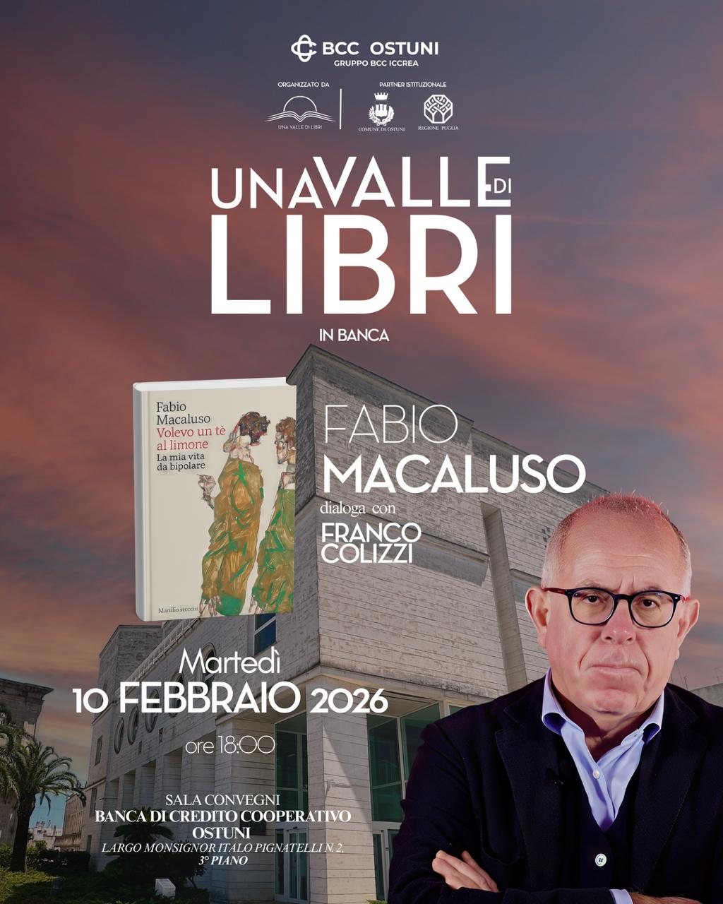 Martedì 10 Febbraio 2026, alle ore 18.00, presso la Sala Convegni della BCC Ostuni (Largo Monsignor Italo Pignatelli n. 2, 3° piano), sarà ospite Fabio Macaluso, che presenterà il suo libro “Volevo un tè al limone. La mia vita da bipolare”, in dialogo con Franco Colizzi.
