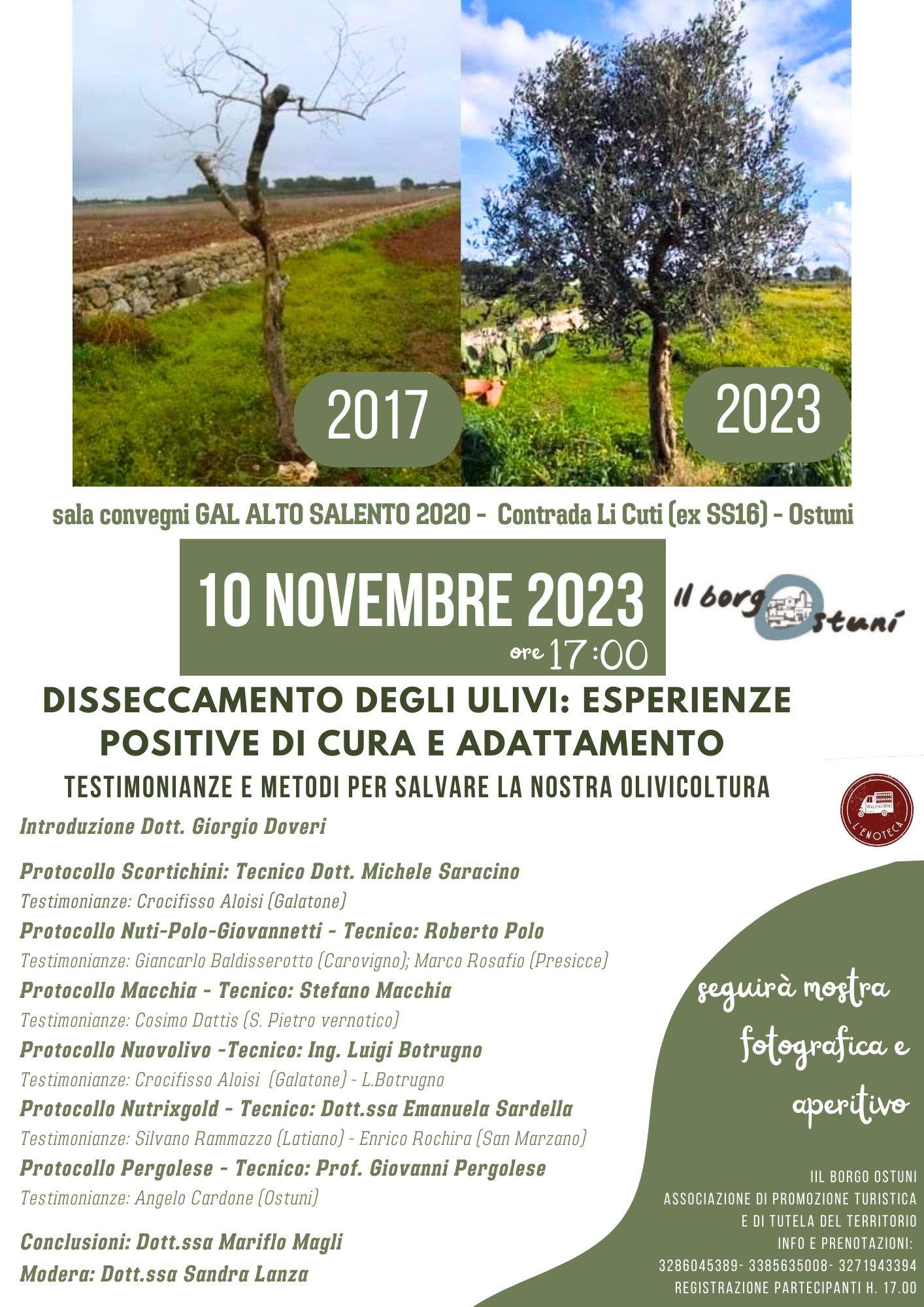 L’evento, organizzato dall’associazione Il Borgo Ostuni, ha l’obiettivo di dare voce ad agricoltori, tecnici e studiosi che possano fornire testimonianze di esperienze positive di cura e adattamento degli ulivi alla xylella e ad altre patologie dell’ulivo ampiamente presenti nel nostro territorio e spesso trascurate.