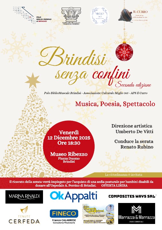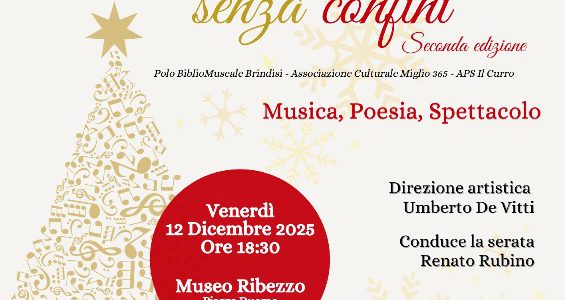 Il Polo BiblioMuseale di Brindisi, l’Associazione Culturale MIGLIO 365 e l’Associazione IL CURRO Aps, organizzano, per venerdì 12 dicembre 2025 alle ore 18:30, al Museo F. Ribezzo di Brindisi (Piazza Duomo), la seconda edizione di “Brindisi senza confini”.