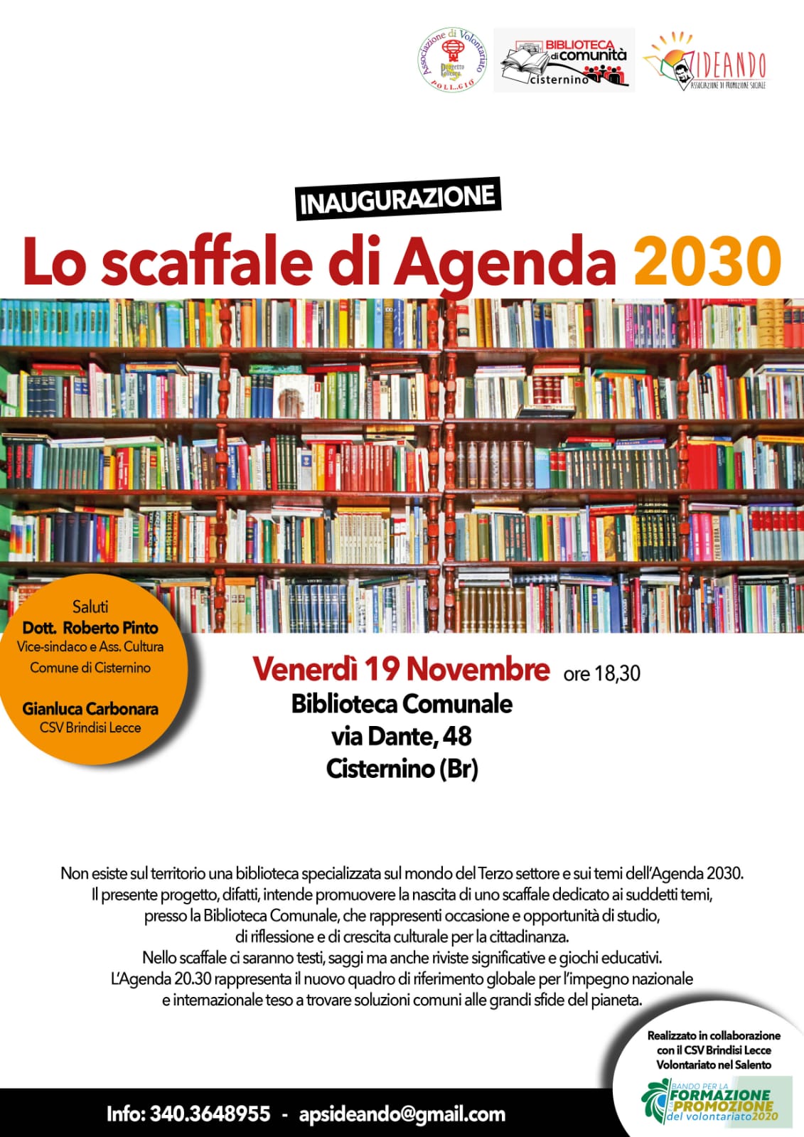 La Biblioteca di Comunità “Tommaso Fiore”, progetto finanziato da Regione Puglia e A.R.T.I. su iniziativa Luoghi Comuni, arricchisce la sua offerta; venerdì 19 novembre alle 18.30 si inaugura “LO SCAFFALE di AGENDA 2030”, un’iniziativa finanziata dal CSV Brindisi – Lecce attraverso il Bando per la Promozione e Formazione del Volontariato – 2021.