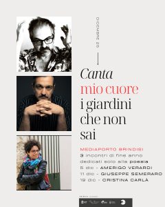 Alla fine di un anno faticoso, compresso, difficile da capire, un anno che ci ha fatto ridere, piangere, arrabbiare, il Mediaporto di Brindisi apre uno spazio di tregua e di profondità. Dicembre diventa un varco e la poesia ne è la soglia: un tempo che si scioglie e che torna a respirare. Nasce così Canta, mio cuore, i giardini che non sai, una rassegna di fine anno interamente dedicata alla poesia, un percorso in tre incontri che unisce voci e sensibilità differenti in una stessa ricerca: restituire alla parola poetica la sua forza di sguardo, di cura e di interrogazione sul presente.