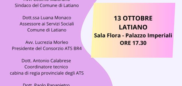 Dopo i saluti istituzionali del Sindaco Mino Maiorano e dell’assessore comunale ai servizi sociali Luana Monaco, interverranno il presidente del Consorzio BR4 Lucrezia Morleo, Antonio Calabrese e Paolo Papapietro – rispettivamente coordinatore tecnico e coordinatore strategico della cabina di regia degli Ambiti Territoriali Sociali provinciali – e il direttore del Consorzio BR4, Francesco Siodambro.