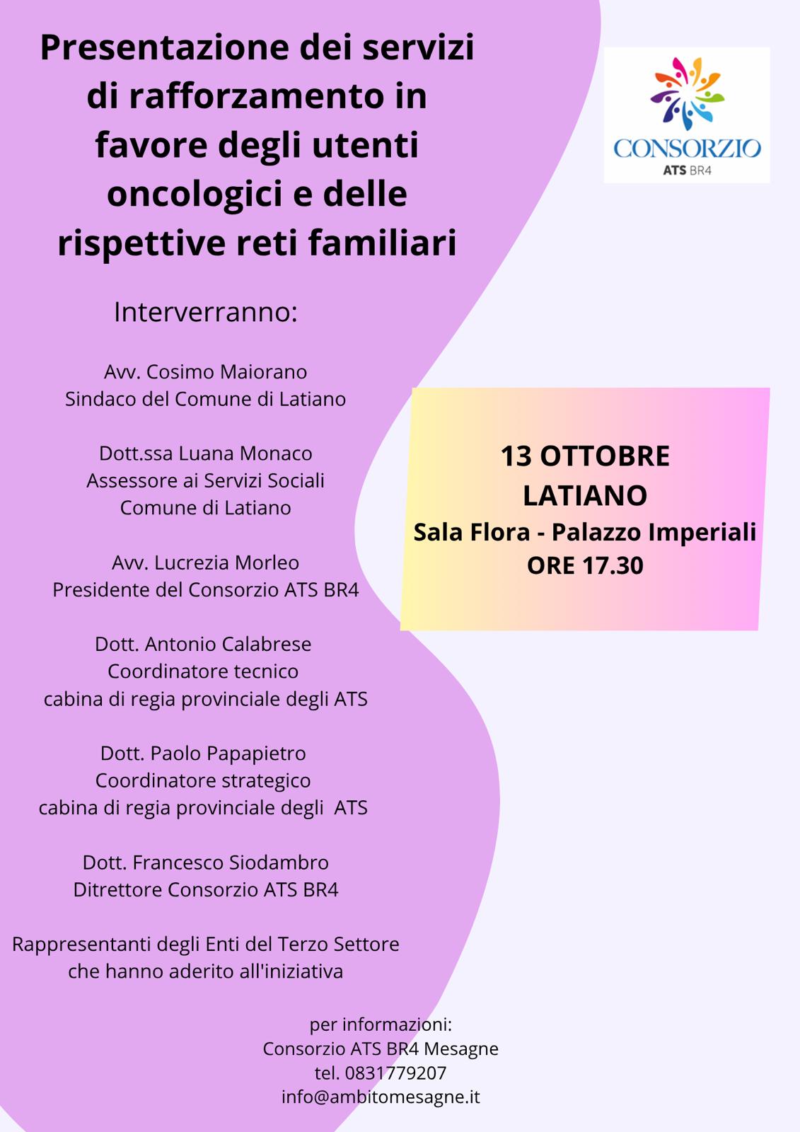 Continuano gli incontri di presentazione dedicati ai nuovi servizi di rafforzamento e sostegno per i malati oncologici nei Comuni del Consorzio ATS Br4. La prossima iniziativa, organizzata con l’obiettivo di illustrare in dettaglio i servizi aggiuntivi in favore degli utenti oncologici e delle loro famiglie, si terrà a Latiano lunedì 13 ottobre, a partire dalle ore 17:30, presso la Sala Flora a Palazzo Imperiali.