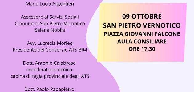 Dopo i saluti istituzionali della sindaca di San Pietro Maria Lucia Argentieri, dell’assessore comunale Selena Nobile e del presidente del Consorzio BR4 Lucrezia Morleo, seguiranno gli interventi di Antonio Calabrese e di Paolo Papapietro – rispettivamente coordinatore tecnico e coordinatore strategico della cabina di regia degli Ambiti Territoriali Sociali provinciali – e del direttore del Consorzio BR4, Francesco Siodambro. L’iniziativa, aperta alla partecipazione di associazioni e cittadini interessati, ospiterà le testimonianze dei rappresentanti degli Enti del Terzo Settore che hanno aderito al percorso, già attivi sui territori con l’erogazione di servizi che spaziano dalle attività di prevenzione al trasporto presso i luoghi di cura, dagli interventi di supporto psicologico e sociale ai corsi per favorire il benessere psico-fisico attraverso le arti e lo sport.