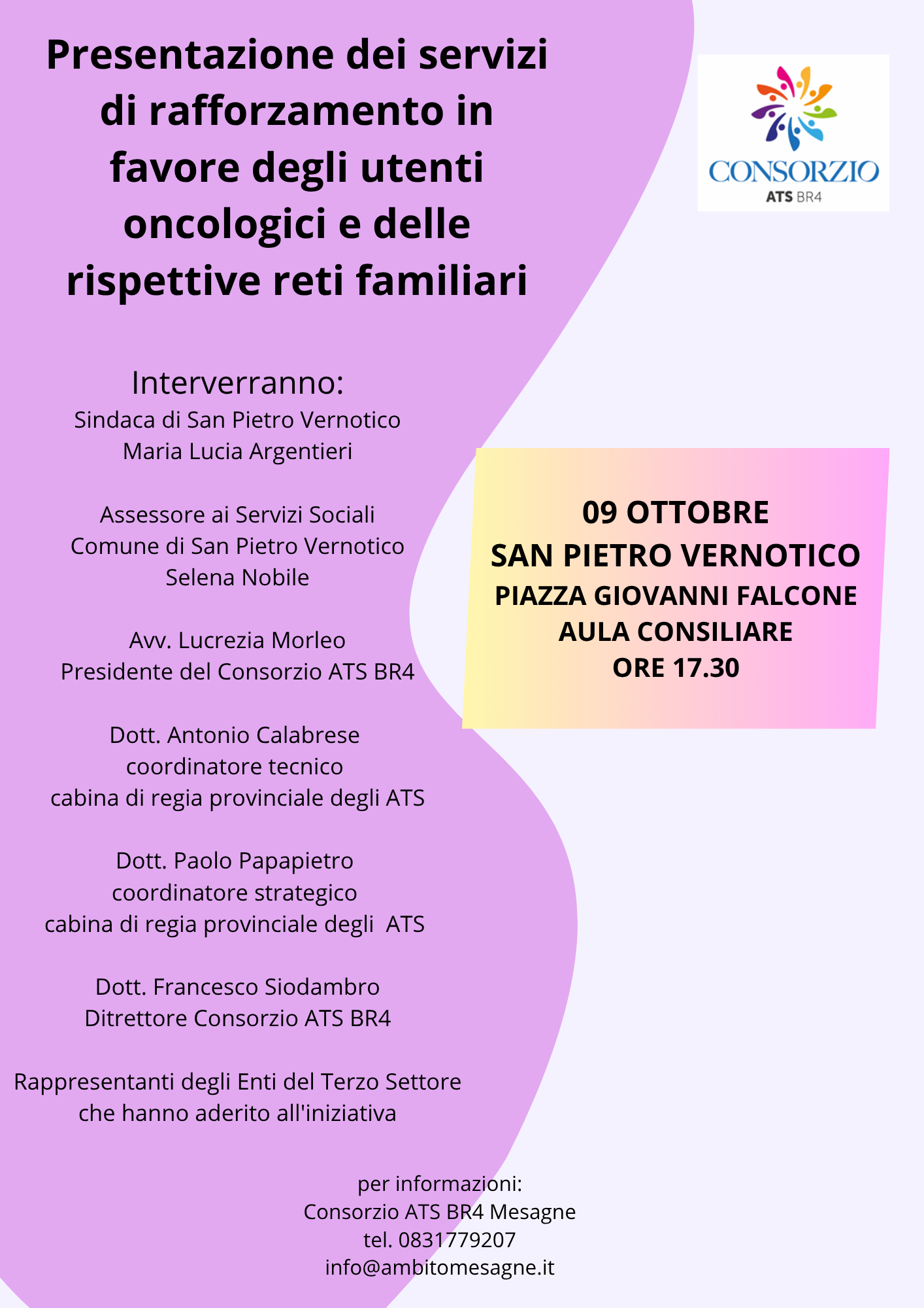 Continuano gli incontri di presentazione dedicati ai nuovi servizi di rafforzamento e sostegno per i malati oncologici nei Comuni del Consorzio ATS Br4. L’iniziativa, organizzata con l’obiettivo di illustrare in dettaglio i servizi aggiuntivi in favore degli utenti oncologici e delle loro famiglie, si terrà giovedì 9 ottobre a partire dalle ore 17:30 presso l’aula consiliare del Comune di San Pietro Vernotico, in piazza Giovanni Falcone.