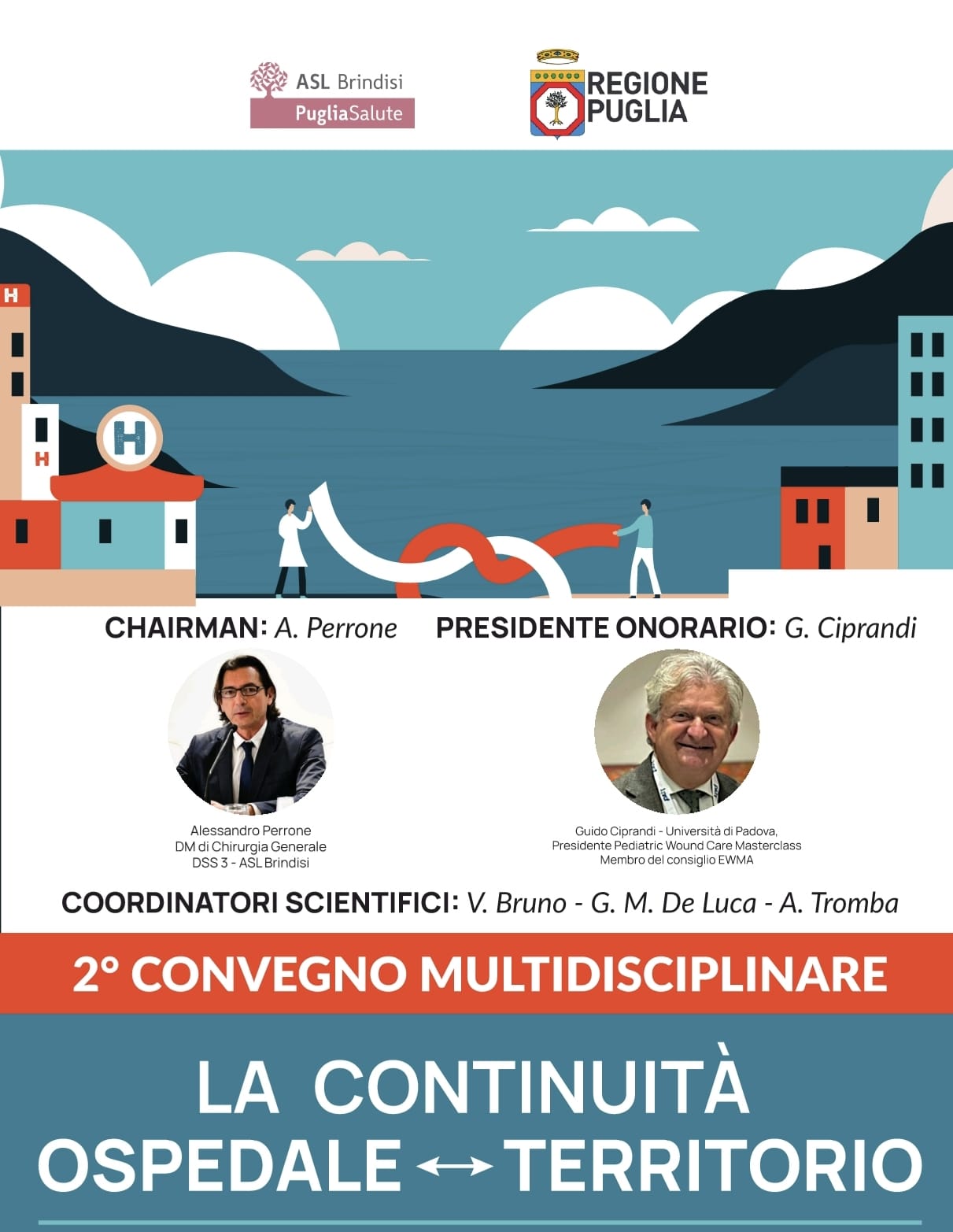 Il convegno vede la presidenza onoraria di Guido Ciprandi, docente dell’Università di Padova, presidente della Pediatric Wound Care Masterclass e membro del consiglio EWMA, e la direzione scientifica di Alessandro Perrone, responsabile del Servizio territoriale Wound Care del Distretto sociosanitario 3 della Asl Brindisi, coadiuvato dai coordinatori scientifici Vita Bruno, Giuseppe Massimiliano De Luca e Antonella Tromba.