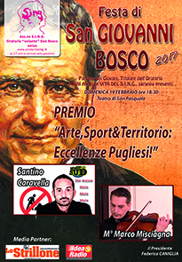 Il premio “arte, sport & territorio: eccellenze pugliesi” a due pugliesi doc! Sarà assegnato al comico Santino Caravella, noto per la partecipazione al programma rai “made in sud” ed al maestro MarcoMisciagna il premio “arte, sport & territorio: eccellenze pugliesi” edizione 2017, il premio, che sarà assegnato durante la ventesima festa di San Giovanni Bosco il prossimo diciannove febbraio, è pensato per sottolineare importanti esperienze nel mondo dell’arte e dello sport che hanno varcato, con prepotenza, i confini regionali pugliesi.
