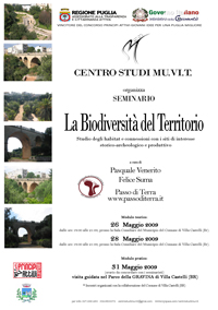 Un Seminario da titolo "LA BIODIVERSITA' DEL TERRITORIO" è stato organizzato, nei giorni 26-28-31 maggio, dal Centro Studi Mu.Vi.T. a Villa Castelli (Brindnisi), nell'ambito del progetto vincitore di "Principi Attivi-Giovani idee per una Puglia migliore" finanziato dalla Regione Puglia, con la partecipazione dell’Associazione culturale Passo di Terra (Ceglie Messapica).