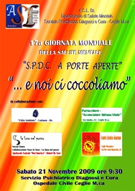 In occasione delle iniziative inserite nell’ambito della 17° Giornata della Salute Mentale, l’ASL di Brindisi e il Dipartimento di Salute Mentale organizzano, per sabato 21 novembre, a partire dalle ore 9.30, all’interno del Servizio Psichiatrico di Diagnosi e Cura (SPDC) dell’ospedale civile di Ceglie Messapica la manifestazione “porte aperte…e noi ci coccoliamo” con l’obiettivo di aprire il reparto al pubblico, da sempre, invece, visto come un istituzione “chiusa”.